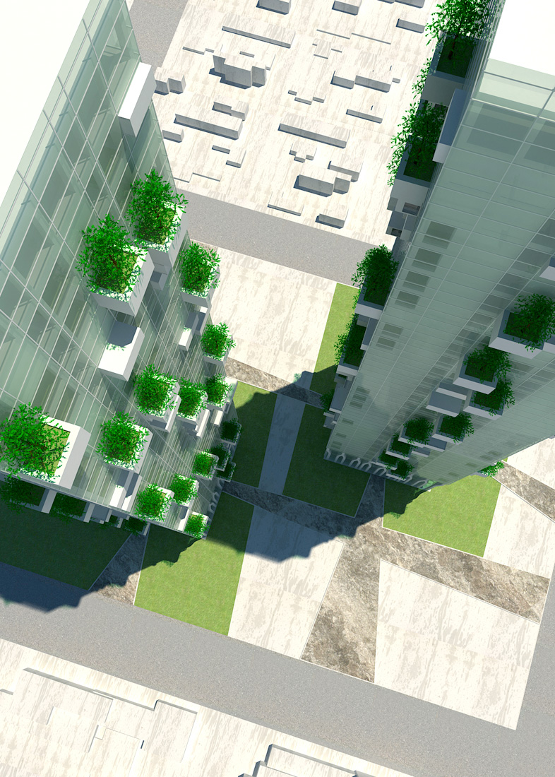Pensare un grattacielo a Roma La città eterna.Significa dare la possibilità di godere un panorama unico al mondo! Lo schema strutturale dell’edificio è elementare. Una griglia accoglie 8 ville per ogni piano e un corpo centrale per le scale e gli ascensori. Lo spazio tra le ville crea due affacci per ogni lato rendendo possibile la vista del panorama a 360° a tutti i piani anche al semplice visitatore, inoltre rende luminosi gli spazi comuni. Ho pensato un edificio con un rapporto uomo – casa – ambiente che parte dall’esterno per arrivare fino all’interno dell’abitazione. Un edificio che da la possibilità di vivere in una villa.Senza perdere il piacere e l’ebbrezza della vista della città ed a stretto contatto con la natura … un grattacielo con le ville! Le ville sono composte da 4 moduli. Modulo A = piano inferiore : living con scala sospesa a vista e ampie vetrate sul giardino, cucina, una camera da letto con cabina armadio, bagno. Piano superiore: 2 camere da letto con cabina armadio e bagno, un area studio con affaccio al piano inferiore. Tutte le finestre affacciano all’intero del proprio giardino.Modulo B = Modulo A + albero Il giardino è vivibile tutto l’anno grazie alla superficie vetrata che circonda il grattacielo. Il grattacielo, a base quadrata, misura 55 metri per lato, ed è alto 207 metri. I primi 4 piani doppi ( h: mt. 6.90 ) sono dedicati ad uffici e sono caratterizzati da pilastri a vista che ricordano il disegno delle torri gemelle a New York … un omaggio all’architetto giapponese Minoru Yamasaki. Nei successivi 25 piani trovano posto 200 ville.L’ultimo piano doppio ospita un ristorante e una spa panoramici. Un grattacielo dove trova posto il verde a servizio di ogni villa e che ospita sulla sua superficie 50 alberi … un vero e proprio parco verticale! |