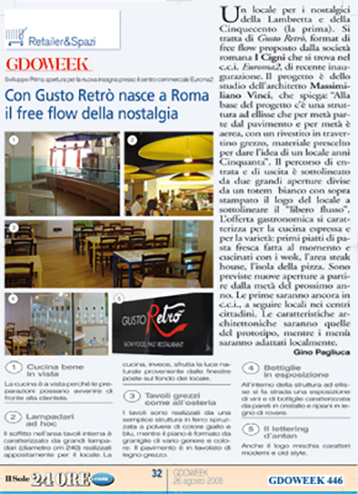 Ristorante A Progettazione e ristrutturazione ristorante Gusto Retrò.Pubblicato sulla rivista ” GDOWEEK” Il Sole 24 ore. Condividi